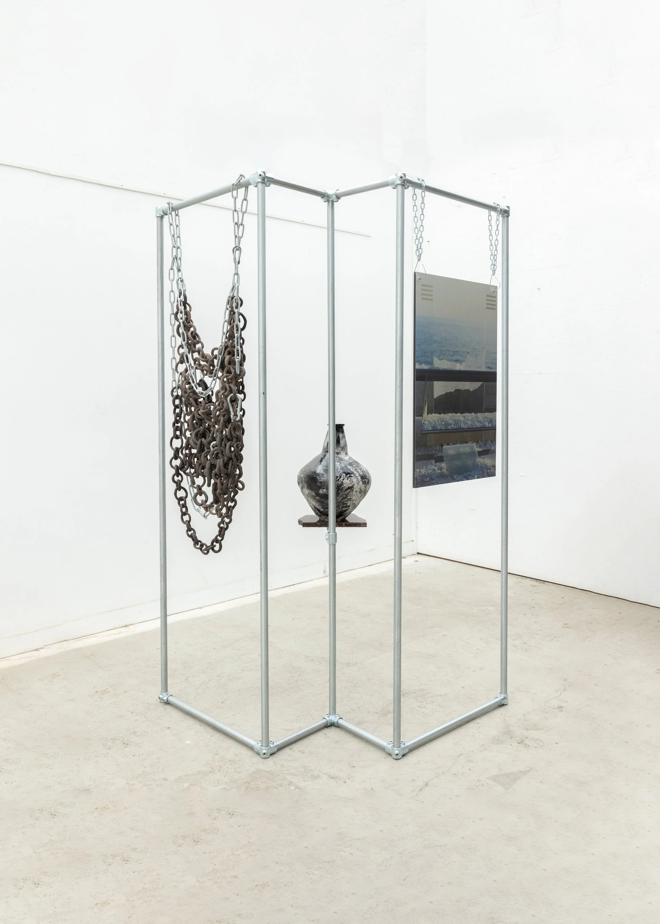 The stoneware amphora, inspired by archaeological artifacts, condenses the sensations of a moving body: vibrations, perceptions, and impressions accumulated while walking. It becomes a symbol of intimate heritage, an object one could leave behind. The sculpture, made of hand-shaped stoneware rings connected by metal chains, conveys the tension between connection and rupture, attachment and instability.